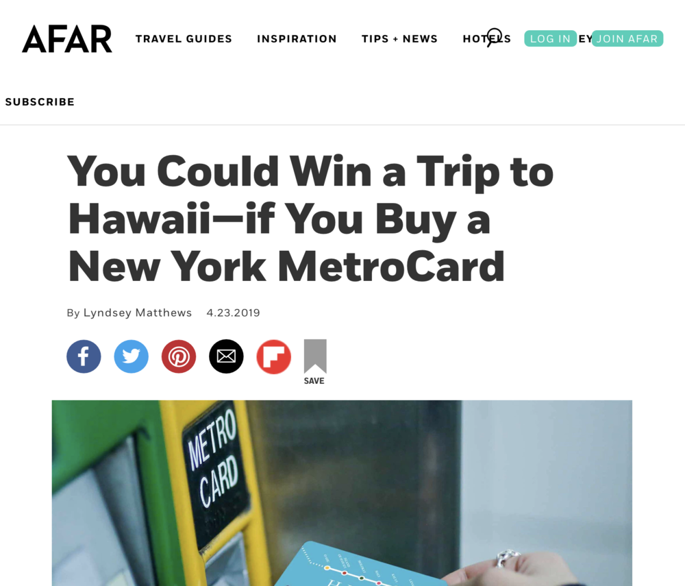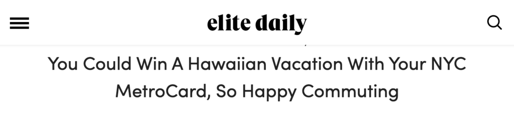 We partnered with NYC MetroCard and turned the subway cards into lottery tickets. Every MetroCard throughout the city would have a number on it and drawings were held to send winners directly to Hawaii. We reintroduced Hawai‘i to NYC through partnerships with six leading tastemaker brands, The Governors Ball, Barry’s Bootcamp, Best Made Co., The Infatuation, Saturdays NYC and Four Seasons, to curate vacation experiences as unique as the islands themselves. In its launch week alone, HIxNY hit 3.2B impressions (including paid and organic social). The campaign was featured in Travel & Leisure, AFAR, Thrillist, Travel Pulse and The Points Guy, along with regional broadcast coverage on Good Day NY, NY1, Fox and more